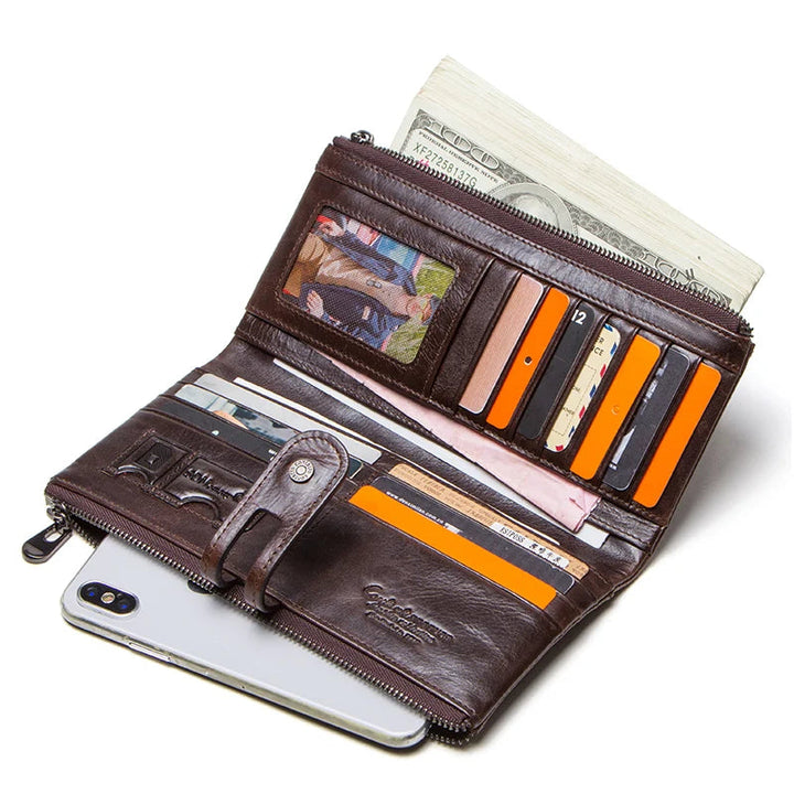 A Carteira Masculina Longa Couro Asterno foi projetada para homens que precisam transportar mais do que o básico, sem abrir mão da elegância clássica. Com um design "Long Wallet" (carteira de mão) em estilo vintage na cor Café, ela une a nobreza do couro legítimo a uma capacidade de organização impressionante.