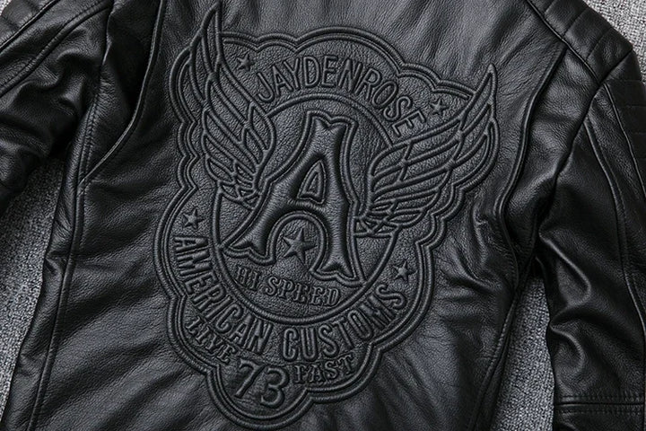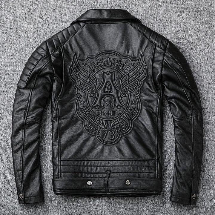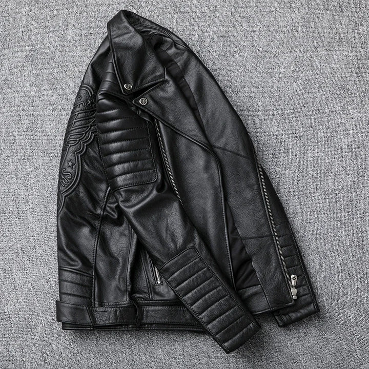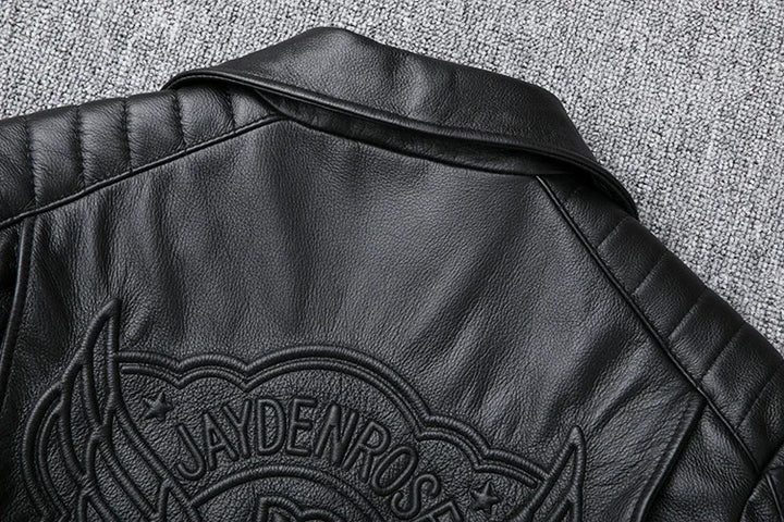 Seu design une estilo motociclista com detalhes modernos, como a modelagem slim, que proporciona um caimento elegante e ajustado ao corpo sem comprometer a mobilidade. A jaqueta possui uma gola dobrável, que adiciona personalidade ao visual, e uma estampa em alto relevo nas costas, reforçando o estilo marcante e exclusivo.