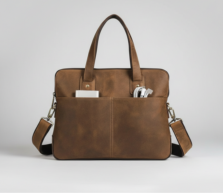Seu design é pensado para profissionais que precisam de praticidade sem abrir mão da elegância. O bolso principal com zíper comporta notebooks de até 16 polegadas, incluindo MacBook Pro 16”, oferecendo proteção segura e acesso facilitado. A maleta também possui bolso traseiro com zíper, dois bolsos frontais abertos e três bolsos internos, garantindo excelente organização para acessórios, documentos e itens pessoais.